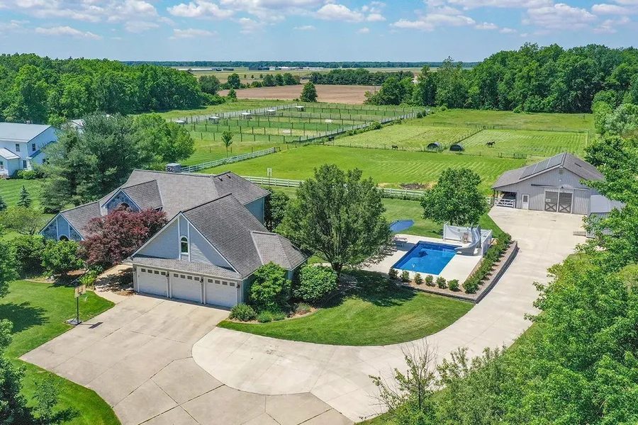 MULTIPLE OFFER NOTIFICATION! Follow your heart to the quiet countryside! Spacious 4 BR 2.5 bath home with an inground pool, a barn and fenced pasture, all on 6 acres with lots of trees and a small orchard. Welcoming porch leads to foyer and living room with wood floors and cathedral ceiling. Formal dining room, chef's kitchen w/all the cupboard and prep space you will ever need. Large island, heated floor, all appliances. Quartz counters. Main floor primary BR features ensuite bath w/heated tile floor plus access to a private screened porch for lazy mornings. Cozy loft overlooks the living room plus 2 bedrooms and bath. Basement has a huge family room and a bedroom w/egress. Zoned heating/cooling. Whole house generator. 33 solar panels. Heated fiberglass pool w/slide. Barn with horse stalls, electric and water. Be ready to call this house your Home!