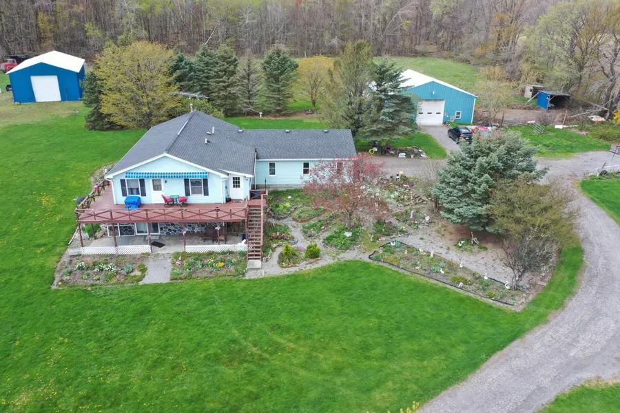 This property consists of a house, barn-shop, pole barn, and pavilion overlooking the 2 acre pond. The house was built in 1991 and includes over 1,400 sq. ft., 3 bedrooms, and 2 full bathrooms. There are 2 bedrooms upstairs with one of the bedrooms being the master bedroom, and a full bathroom. The kitchen and living-dining room are a spacious open concept area. The downstairs is a partially finished basement which includes another bedroom and a full bathroom. Washer and dryer hook ups are upstairs and downstairs. The basement has ingress and egress allowing you to turn the downstairs into additional living space including a potential mother in-law suite. There is an attached 2 car garage with a large mudroom. The house has a septic, well, and natural gas.