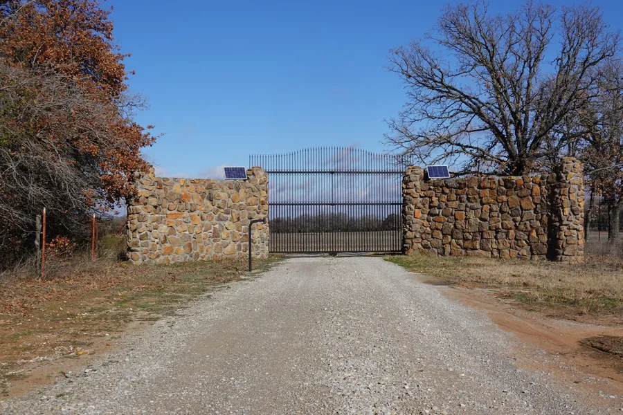Entrance: The ranch's private entrance features an impressive sandstone archway with an electric gate and keypad. An all-weather rock road lined with beautifully manicured post oaks leads back to the family home and barns in a private location.