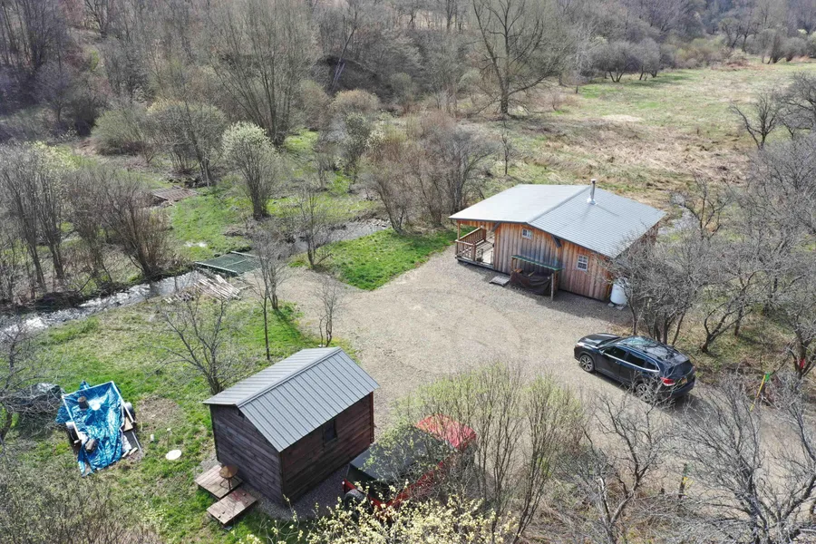 This new custom-built cabin is insulated and has electric installed. Currently, it is powered by a generator but can easily be connected to power with electric located at the road. It includes a composting toilet that has never been used. Septic and well can be installed by the new owner. There is a wood stove and a propane heater. Spacious living room and kitchen. The bedroom area can be closed off for privacy. Start your morning with coffee on the back porch overlooking the creek. A 6 x 12 shed for storage is also included.