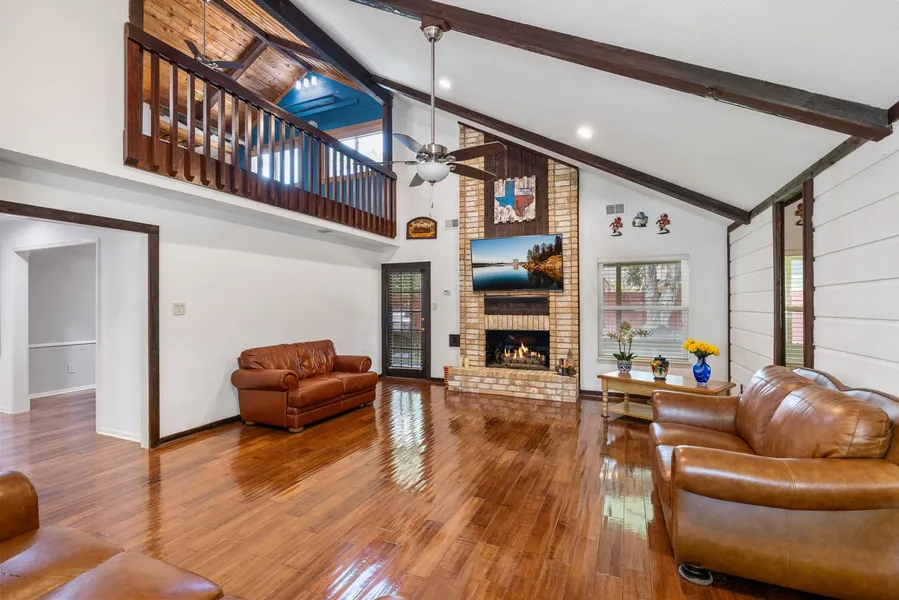 Beautiful 4 bedroom, 2.5 bath custom home in Champions Park Subdivision. Spectacular contemporary elevation with cedar garage door and beautifully landscaped front yard. This home makes a great first impression. Beautifully updated kitchen with granite counters, tumbled tile backsplash, stainless appliances, a breakfast bar & butlers pantry. The den/family room is stunning with a floor-to-ceiling gas log fireplace, beautiful hardwood floors, vaulted-beamed ceiling and a painted cedar accent wall. Large primary with gorgeous wood floors, and a beautifully updated bath that features granite counters, dual sinks, jetted tub & shower. You will love the rustic upstairs game room with vaulted cedar ceiling and a large wet bar. Gorgeous wood flooring in entry, den, dining & primary. The screened patio across the entire back of house is a great place to relax. Steel roof with remaining 20 yr warranty. Hardy siding-nice added feature. HVAC replaced in 2025/Water heater replaced in 2023.