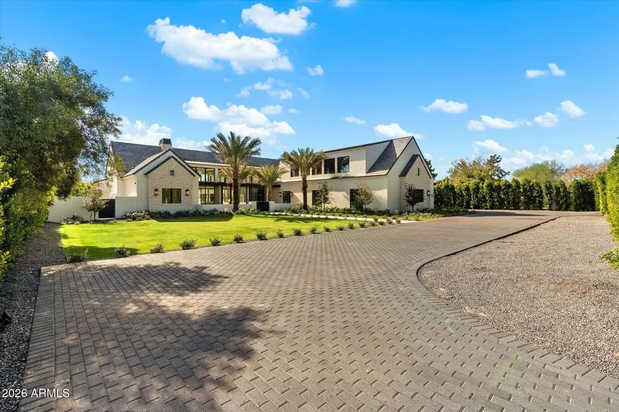 This Brand New Estate on over 1 Acre on Exeter, features a split floorplan: Primary Suite + Primary Outdoor Retreat/Spa + Office + Powder Room on one side with 4 Kids Ensuites around a Game Room on the other side. The Light and Bright main living spaces split the Main Level with a Designer custom Kitchen with double Taj Mahal stone islands, a full back Kitchen, multiple sub zero refrigerators and freezers, enormous Laundry Room with Mudroom, and an oversized 6 Car Garage. Upstairs boasts a 6th Ensuite 2 bathrooms, Theater, Gym, Bar + Gym & Golf Simulator Room. Enjoy Arcadia Proper's most coveted neighborhood, Lombardi Estates, on Exeter, with this stately gated estate by Award Winning Builder Norton Luxury Homes.