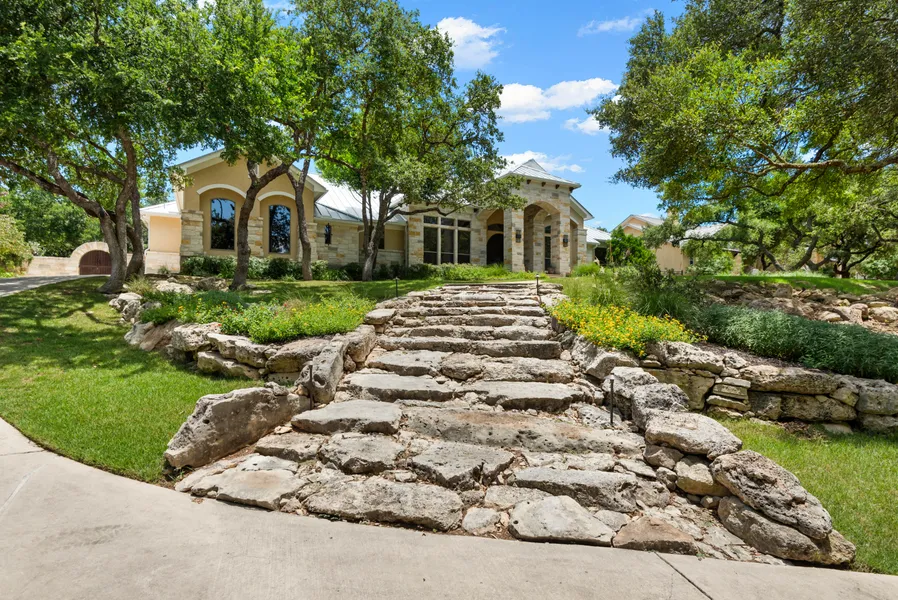 Spectacular Texas Hill Country living, perched atop a premier acre lot within River Crossing, featuring a newly replaced standing seam metal roof. Exquisite finishes and craftsmanship are found to include upgraded light fixtures, decor paint, family room with a vaulted ceiling and stacked stone fireplace, and a chef's kitchen complete with large island, stainless steel appliances/gas cooking, double ovens, and extensive built-ins for ample storage. Master retreat features a large spa-like bathroom with separate vanities and His & Her closets. Guest bedrooms are spacious with en-suite bathrooms and a possible 4th bedroom is found up front at the study with built-in murphy bed. A stunning outdoors oasis designed for entertainment and relaxation. The large covered patio with a wood paneled ceiling provides a cozy and elegant outdoor living area that is perfect for hosting friends and family. The flagstone hard decking adds a touch of sophistication and durability to the outdoor space. The Keith Zars 26,000 gallon beach entry pool is a standout feature of this property, complete with a waterfall, grotto, basketball hoop, and hot tub. The pool area also includes a full outdoor cabana with a pool bath / outdoor shower, breezeway/dining area, and a bar/prep area, making it an ideal spot for outdoor entertaining. The covered outdoor BBQ/grilling station is perfect for any outdoor chef and summer barbecues. Multiple entertaining areas and spaces throughout the outdoor space allow for plenty of room for everyone to enjoy themselves. The raised garden adds a touch of natural beauty to the outdoor space, while the putting green provides a fun activity for golf enthusiasts. World class amenities nearby to include golf and private river access.