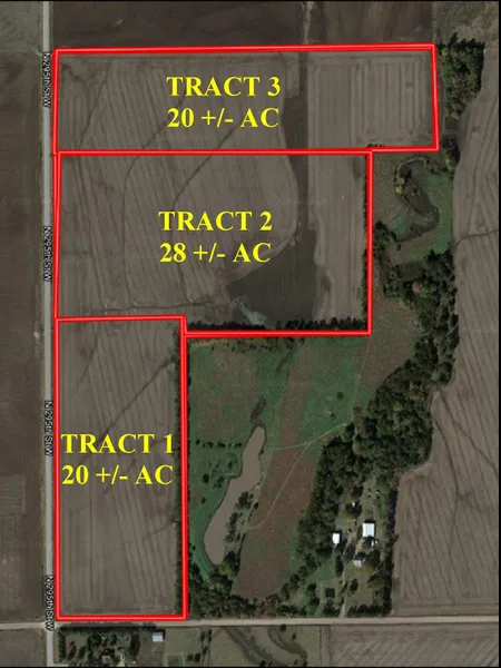 DESCRIPTION: Great opportunity to purchase choice of 3 small acre tracts 2 miles north of Garden Plain, KS. These tracts would make great homesites and is in the Renwick School District. There is blacktop frontage and electricity is available. Tract 1 consists of 20 +/- acres to all cultivation, Tract 2 consists of 28 +/- acres to all cultivation, and Tract 3 consists of 20 +/- acres to all cultivation. Acreages are subject to an official survey.
