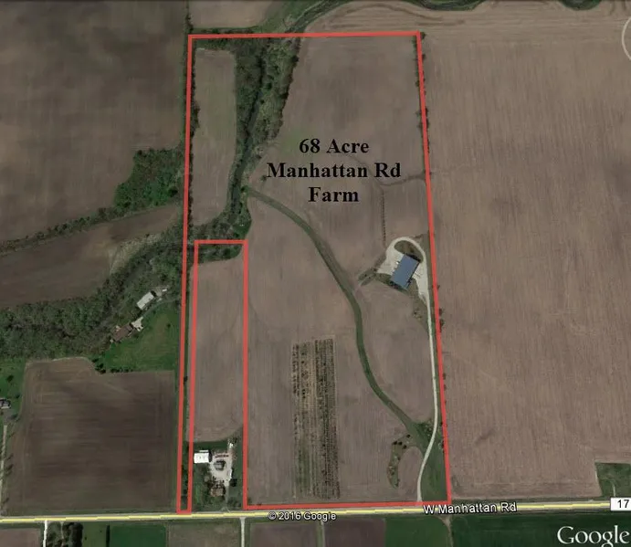 68 acres with frontage on Manhattan road. The parcel is only half a mile east of Rt. 53. Large 160 X 81 Machine Shed with heavy electrical power. Former landscape nursery. Shed was used for truck storage. Good soils, approximately 3 acres of nursery stock to be removed by the end of 2016. Many potential uses in an area of industrial development.