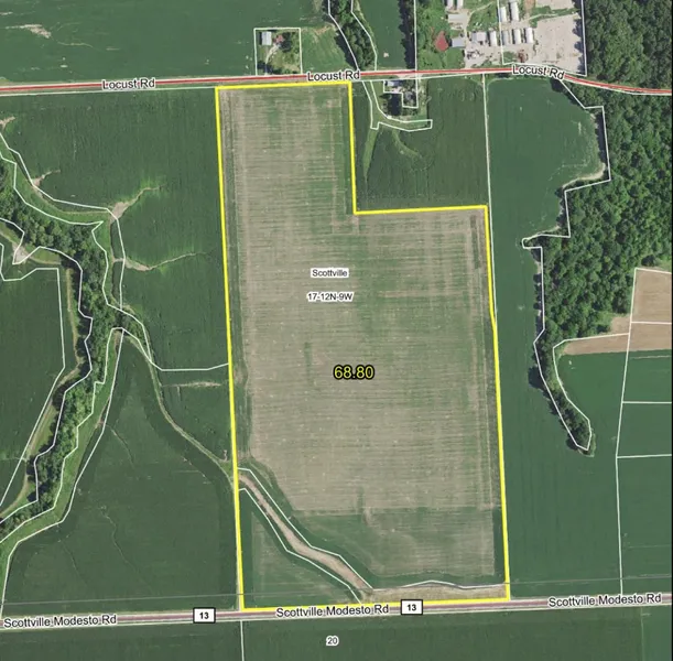 This is a nice-sized tract of Class A tillable farmland in a strong agricultural community just west of Scottville in Macoupin County, Illinois. Consisting of 68.80 total acres, the tract is 97% tillable with 66.81 acres being in production. The tillable acreage carries a Class A weighted Productivity Index Rating of 134.2. The farm is easily accessible from the Scottville Modesto Road to the south and Locust Road to the north.
