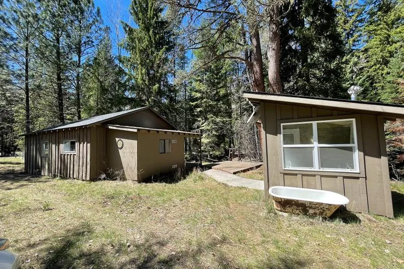 Private dry cabin on Bear Creek surrounded by trees on nearly an acre. This special property is off grid, fenced, with a composting toilet, shower (not plumbed) wood stove, two new chimneys, and has propane installed for the new refrigerator and lights. There is a wood storage shed, and three additional structures on the property including an outhouse. There is one bedroom and two additional bunk beds in a nook off the kitchen. Seller is leaving everything included in the pictures including a hammock, portable propane stove with table for outdoor cooking, barbeque, refrigerator, furniture, bedding, books and games.