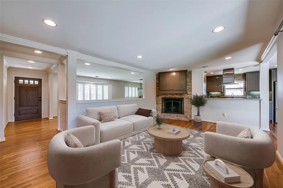 Updated charming home in Lakewood Elementary, freshly painted throughout and showcasing pristine hardwood floors and plantation shutters. This three bedroom, two and a half bath home has multiple living areas and a large backyard. Chef's kitchen is updated with quartz countertops, stainless steel appliances, gas burner, double oven and ample storage space. Breakfast area is complete with built-ins, wine refrigerator, and overlooks patio and backyard. Large primary suite has two closets and updated bathroom. Two additional bedrooms are also spacious and share an updated bathroom. Ample parking includes attached two-car garage, an addiitonal parking space by the backyard and a circular driveway. A beautifully maintained home ideally situated in the middle of a great block in Lakewood Trails. Conveniently located close to shopping, restaurants and White Rock Lake.
