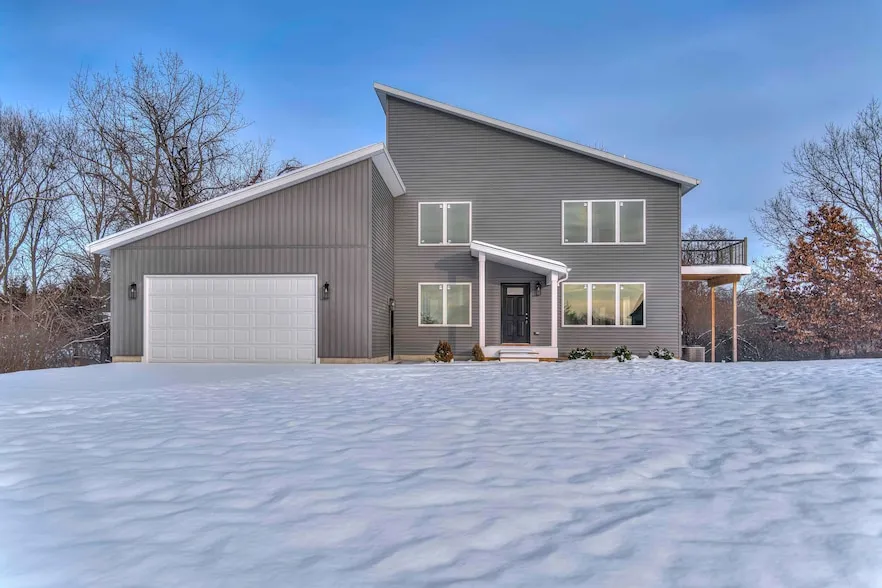 Brand new 2025 contemporary home w/captivating lake views, part of a chain of 7 lakes, seasonal views of Price Lake. Thoughtfully designed w/4 bedrooms & 3.5 baths, attached 2-car garage on 2.16-acre lot. Welcoming foyer opens to living rm. A stunning kitchen showcases granite countertops, center island, soft-close cabinetry, ample storage, & a full appliance package. Dining area opens to deck, perfect for grilling out. Main floor bedroom or use as a home office, full bath & laundry. Upstairs offers 3 BR, full bath. Serene primary suite w/a private bath, walk-in closet w/built-ins & balcony to enjoy coffee with a view. Finished basement has family rm, 1/2 bath, & generous storage. High-end mechanicals: 2 furnaces, tankless water heater, LED recessed lighting, 200 AMP service. Surrounded by peaceful water & nature views w/out paying the waterfront taxes. Potential to build a barn-confirm w/township.