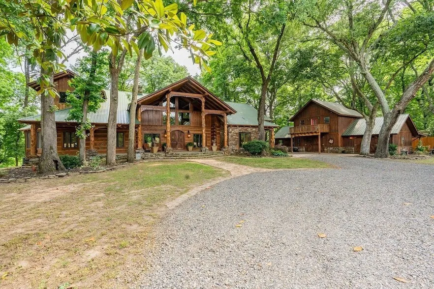 This magnificent, custom built log home is constructed with all of the finest expertise. Enter into the impressive living area with a massive fireplace to be greeted by the beautiful views of the river. This 5 bed, 3.5 bath home has multiple options for additional sleeping arrangements, dedicated office space, primary w/ensuite and loft area overlooking the river, and a guest bedroom with ensuite on the main level. Upstairs offers another loft area suitable for a bedroom and/or gameroom. The chef's kitchen features commercial grade Viking and SubZero appliances and granite countertops. Downstairs you will find another spacious living area, kitchenette with laundry, 2 guests bedrooms and bath, a full bar for entertaining and wine cellar with a table for those special wine tastings or a game of poker. The impressive front porch with lodge style log beams catch your eye as you pull into the circular drive. Off of the sunroom a peaceful escape on the covered porch overlooking the river awaits. Easy access to the private dock with boat slip and sitting area for fishing. The shop is ready to house whatever hobby suits and the apartment upstairs offers additional living space. Must See!