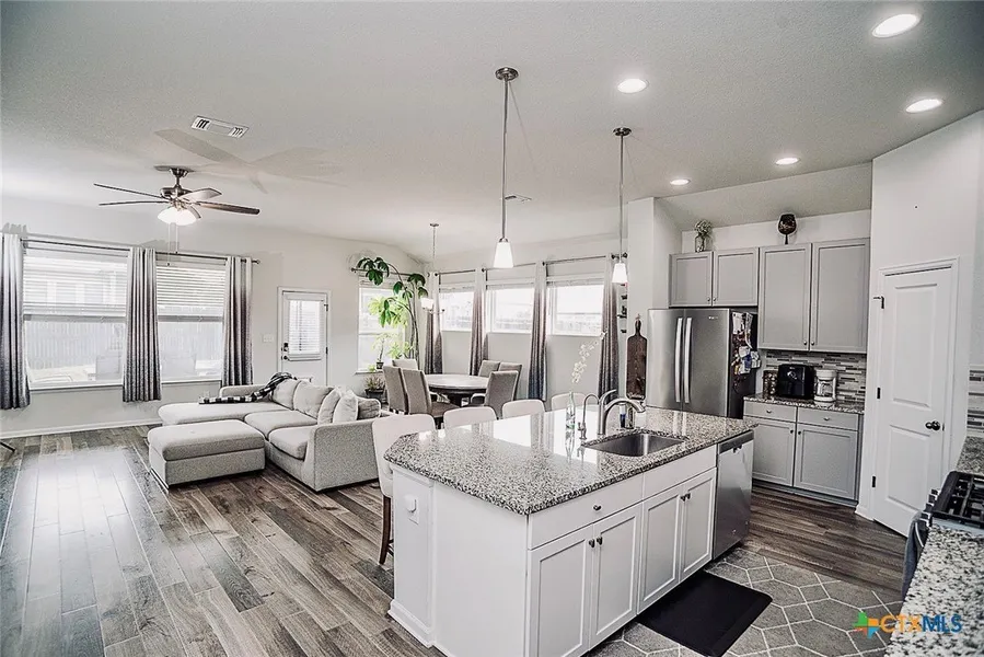 This beautifully maintained six-year-old David Weekley home offers exceptional comfort and style, perfect for anyone seeking a luxury lease opportunity for a year or more. Situated on a spacious corner lot with a fenced backyard, the home features three bedrooms, two baths, and a large flexible dining space ideal for multiple uses. The gorgeous kitchen includes gas cooking, while the expansive primary suite offers a dual vanity and super shower. Outdoor living is a highlight, with a flagstone patio, outdoor kitchen, and a convenient small dog door. Modern upgrades include solar panels for low energy bills, an extended garage, flagstone pathways, a full sprinkler system, and a water filtration and softener system. Refrigerator, washer, and dryer are all included. With convenient access to Austin, San Marcos, and San Antonio, this home combines comfort, efficiency, and an excellent location for an outstanding lease opportunity.