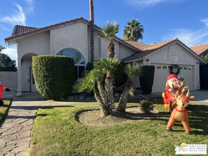 Set in the middle of the Coachella Valley's famous Candy Cane Lane is a perfect 3 bed, 2 bath split level home. The kitchen has granite countertops and stainless steel appliances. There's access to the large L-shaped pool and spa from the living room, upstairs bedroom deck and the master bedroom patio. The attached 2-car garage is actually big enough for storage on both sides. You'll be close enough to walk to Panorama Park for baseball, tennis and soccer. Panorama Park also has walking paths and a playground. Simply because you're on Candy Cane Lane, the street is highly desirable (within the city) due to its built-in sense of community and festive holiday spirit. This is a wonderful opportunity for first-time buyers, an investor, or anyone looking for a centrally located home in a friendly neighborhood.