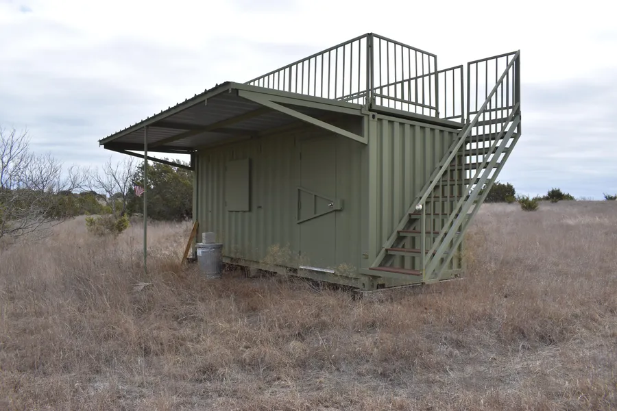 The property includes a custom container with a rooftop terrace, which can be used for secure storage or transformed into a weekend getaway camping headquarters. There is a hunting blind and feeder set up for hunting white-tailed deer or hogs. Additionally, feeders, bird boxes, and watering sources are in place to maintain the Wildlife Exemption.