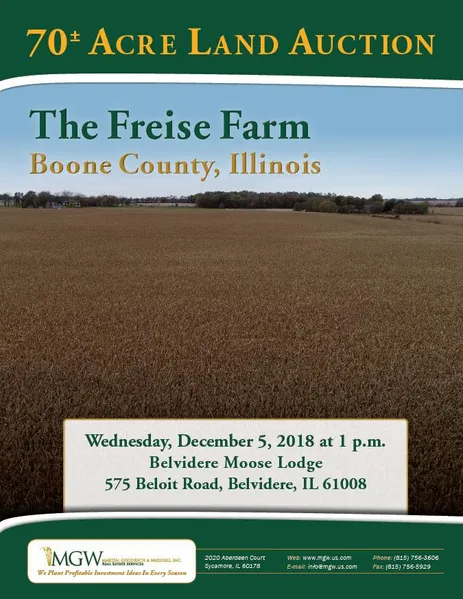 Legal Description: A brief legal description indicates The Freise Farm is located in Part of the Northwest Quarter of Section 22, Township 44 North Range 4 East (Bonus Township), Boone County, Illinois.