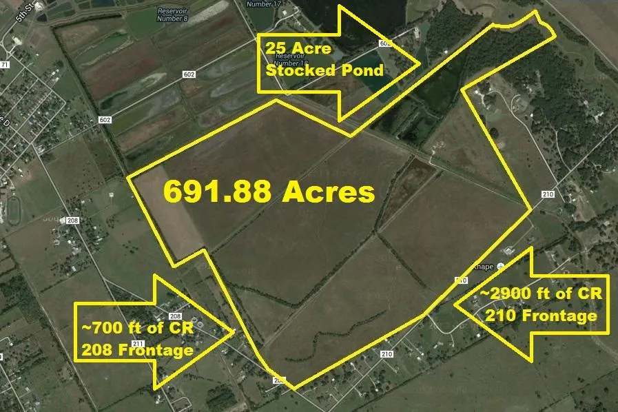 ~692 Acre Waterfront Prime Farmland by Danbury with 25-Acre Lake, ~1600 ft of Bastrop Bayou Frontage, ~2982 ft of CR 210 Frontage & ~655 ft of CR 208 Frontage. Ag Exempt! Commercial, Multifamily or Residential!! Formerly farmed for Millow's corn, rice & hay. Irrigation canals & road run through fenced property. Current leases: cattle/horses & oil drilling. Great for Investor! Entrance to property is from CR 210. LA Must Accompany Due to Livestock on Property!