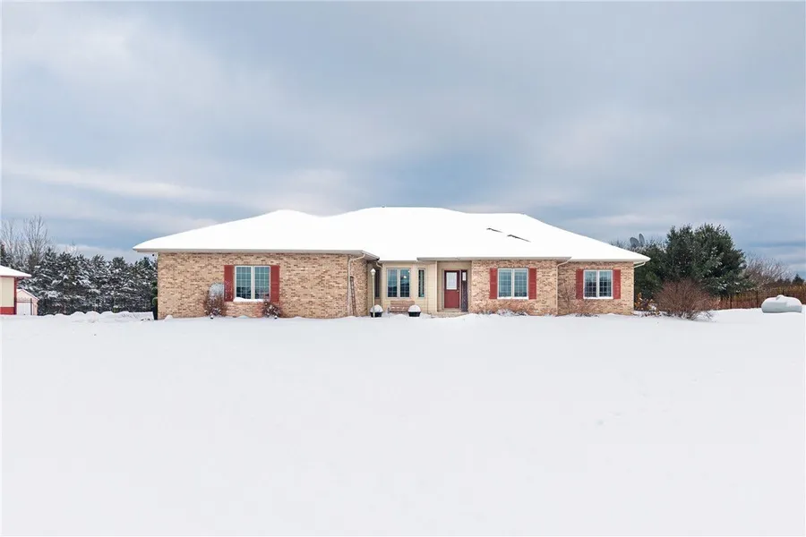 Welcome to this beautifully maintained 4 bedroom 2.5 bathroom ranch in the Town of Wheaton on just over 5 acres- discover peaceful country living just minutes from Chippewa Falls and Eau Claire with easy access to Highway 29. The main floor features a bright, open layout with generous living, dining, and kitchen areas and even has a central vac system! All living area, bedrooms, and amenities including laundry are on the main level with a very spacious primary suite and a newly updated walk-in closet. The huge completely open lower level is a blank canvas- perfect for future finishing with endless possibilities. Recent updates include a brand-new furnace, new light fixtures and ceiling fans, new fridge, a beautiful screened-in back patio with brand new sliding doors perfect for relaxing and enjoying the private fully fenced backyard. Two car attached garage is heated and has hot & cold water spigots. Additional one car garage door in pole shed building along with the main double overhead door- plenty of room for cars, boats and equipment. Pole Building (30'x52'x10') includes an in-floor heat system. Take advantage of the charming and convenient outdoor amenities like the 15,000 gallon 32x16 above-ground pool, additional storage shed with electric (10'x20'), lawn sprinkler system, and extensive new plantings including berry patches, grapes, four apple trees, two cherries, and a plum tree! Conveniently located in Chippewa Falls with Wheaton taxes. Move-in ready with room to expand!