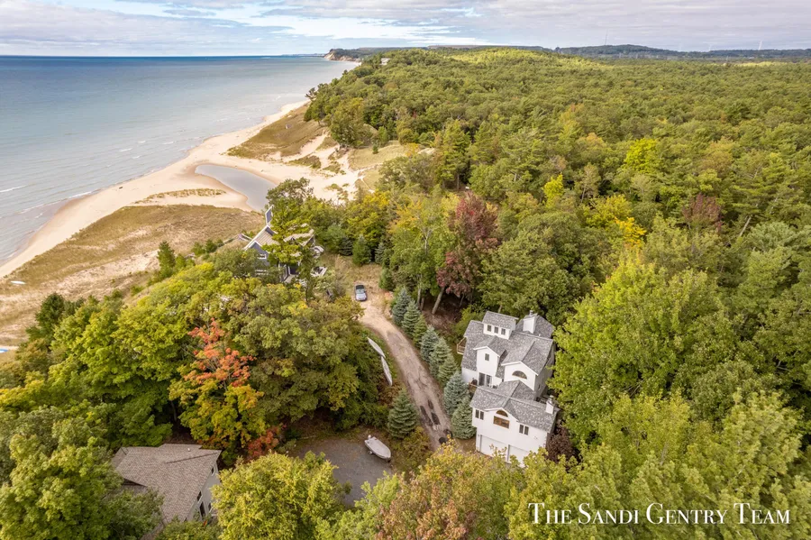 Your Private Lakeshore Escape Awaits: Nestled among the trees with deeded access to Lake Michigan just steps away, this spacious 4-bedroom, 3 full bath retreat offers a rare blend of comfort, privacy, and natural beauty. With two easement paths, one leading to Lake Michigan and the other to a serene creek connecting to Bass Lake and the shoreline this is your chance to truly embrace lakeside living. The main living level features an open dining area and kitchen with warm wood cabinetry, hardwood floors, and a wood-burning fireplace. Two bedrooms, a full bath, and laundry are also on this level, with each bedroom offering a private deck to soak in the quiet, wooded surroundings. Upstairs, the entire second floor is a private primary suite, complete with a wood-burning fireplace, full bath and a large sitting area or office. Two additional bedrooms branch off this level, offering flexibility for guests, work-from-home needs, or a personal retreat. Step out onto your private deck for beautiful views of Lake Michigan. At the top, a charming widow's watch invites you to savor sunrise, sunset, or the soothing sound of waves during the day. The walkout lower level features a cozy family room with a gas-log fireplace, a third full bath, and access to the deck perfect for relaxing or entertaining after a day on the water. All of this just minutes from downtown Pentwater, Ludington, and Silver Lake. A unique home for nature lovers, beachgoers, and anyone dreaming of a peaceful Lake Michigan lifestyle.