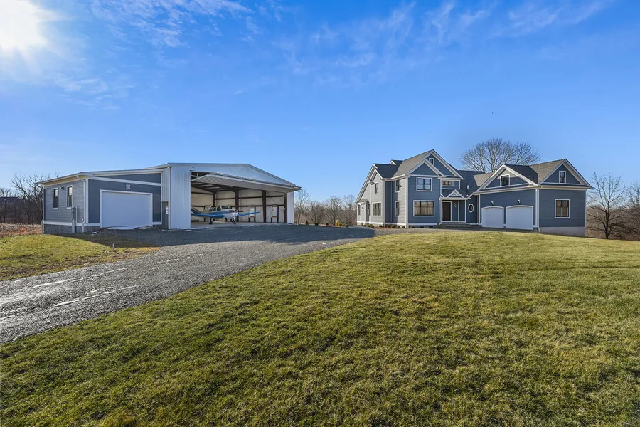 FLY-IN property situated in a gated cul-de-sac neighborhood adjacent to Sky Manor Airport. Unique zoning allows airplane hangar on property and airplane access, (or right-of-way), leading to Sky Manor runway. The construction is recently finished and includes a single-family house plus an airplane hangar, (50'x50' exterior measurement). 1st floor primary bedroom, work from home office, vaulted ceiling with architectural details, open concept floorplan, 2 laundry rooms (1st and 2nd floors), and interior & exterior fireplaces. The kitchen offers all you can imagine with open shelving, center island with granite counters, soft-close drawers and cabinets & full-sized walk-in pantry. The primary bedroom with two walk-in closets, French door to composite deck with fireplace, and a luxurious bathroom which includes an enormous, curbless shower with multiple showerheads, linear floor drain, free-standing tub and mounted towel warmer. The mechanics and design are top shelf... Andersen architectural 400 series windows, 5 Andersen doors to deck and rear, super high efficiency tankless water heater for 6-zone baseboard heat, Goodman CAC compressors mounted on platforms, 400 AMP electric, Hardi Plank and Azek style siding, 2 car attached garage plus one car attached to the hangar! Insulated airplane hangar with 18' ceiling, steel "I" beam construction, bi-fold door with auto opener, concrete floor, Andersen windows, full (50'x50') basement underneath and metal siding with stone veneer.