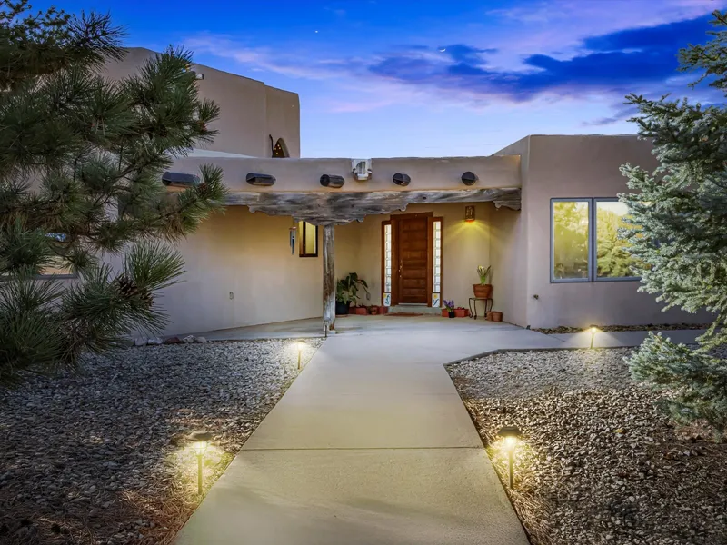 Nestled on 2.56 acres off Rabbit Road in Santa Fe, this spacious 3,084-square-foot home with two car garage offers breathtaking views of the Sangre de Cristo and Jemez mountains. Designed in classic Santa Fe style, this two-story residence features traditional vigas and beams, Saltillo tile flooring, and an abundance of natural light from large windows and skylights throughout. The primary suite is privately located upstairs, while three additional bedrooms are situated on the main level. The open floor plan provides ample space for both relaxation and entertaining, while the stairway's wood accents add warmth and character to the home. Start your mornings in the cozy east-facing breakfast nook, where you can enjoy your coffee as the sun rises over the mountains. In the evening, unwind in the west-facing hot tub, watching the sky transform with the colors of a Santa Fe sunset. The formal dining room and spacious kitchen make hosting effortless, offering plenty of room for gatherings both large and intimate. Enjoy the convenience of a neighborhood with no homeowner's association, offering flexibility and privacy. With a prime location near Santa Fe's amenities, this home offers a unique opportunity to experience the beauty and culture of the region. The seller is offering 1.5% of the sales price toward the buyer's closing costs or property improvements. Recent updates include a 10kW ground-mounted solar panel system (2023), a garage wired for EV charging, and new garage doors. Enjoy stunning sunset views from the Hot Springs 7-person spa (under manufacturers warranty until January 2026) next to a newly built deck. The home also features a high-efficiency combined boiler and tankless water heater for optimal energy savings. In the kitchen, a new Bosch silent dishwasher and garbage disposal provide quiet convenience. Additionally, the TPO roof, originally installed in 2019, was professionally sealed and maintained in March 2025 to ensure lasting durability.