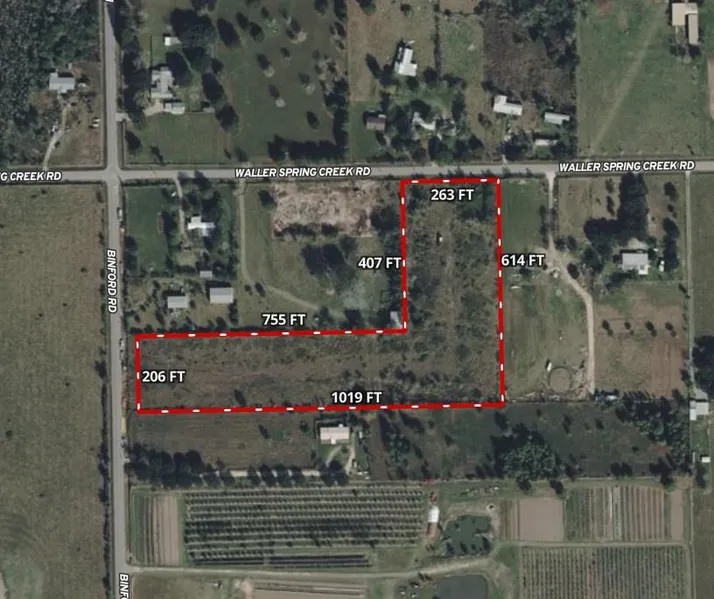 Unrestricted 7.2 acres with frontage on Binford Rd & Waller Spring Creek Rd. just 1 mile north of FM 2920 and 2 miles north ofHwy 290. High traffic roads as development is quickly increasing in the Waller area. A 40' culvert/entrance on Binford is inplace. A smaller culvert/entrance is on Waller Spring Creek frontage. 3-phase electric is readily available. See attachments/documents for dimensions. Check it out!