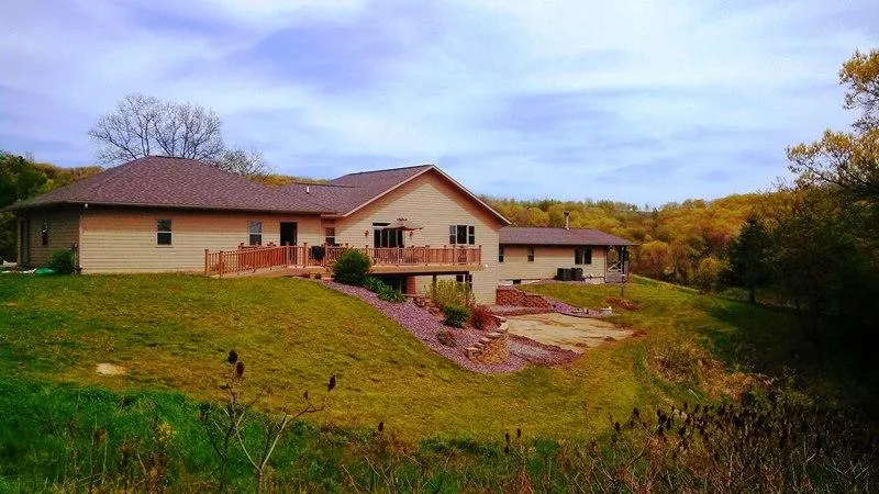 This phenomenal property boasts a 5000 plus square foot custom home strategically situated on 70 breathtaking acres in Southwest Wisconsin. From any view in this home you will be witness to an abundant natural wildlife sanctuary. It is highlighted by groomed trails winding through woods, deer, turkey and other native wildlife, natural springs, multiple groves of raspberries, apple trees, farmed fields, rolling hills and fern grottos.