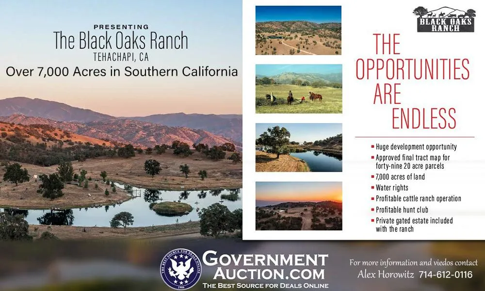 A once in a lifetime opportunity awaits you at the picturesque Black Oaks Ranch. A beautiful 7,000-acre private ranch in Southern California, sitting in the Tehachapi Mountains just 80 miles north of LA. Highlights include limitless views in every direction, multiple water systems, solar power, an abundant lake, horse and hiking trails, wildlife, cattle operation, hunting club, and development opportunities. Ranging from valley floors and mountain sides, this ranch has been lovingly developed and maintained. The entire property is fenced and has 23 miles of roadway as well as trails throughout, perfect for horseback riding, hiking, and off-roading. Black Oaks Ranch includes developed and natural water systems that provide for cattle, wildlife, and vegetation throughout the property. Solar powered water wells, numerous ponds & streams give water throughout the ranch as its own natural resource with potential to wholesale water. The property includes a 7-acre lake for swimming, boating, and fishing stocked with bass, crappie, golden belly shiners, bluegill and sunfish. Black Oaks Ranch brings your dreams to life. Incredible views and spectacular wildlife; deer, elk, wild pig, bobcat, coyote, smaller game, quail, and more! There's so much to be seen at the majestic Black Oaks Ranch, so don't let this opportunity pass you!