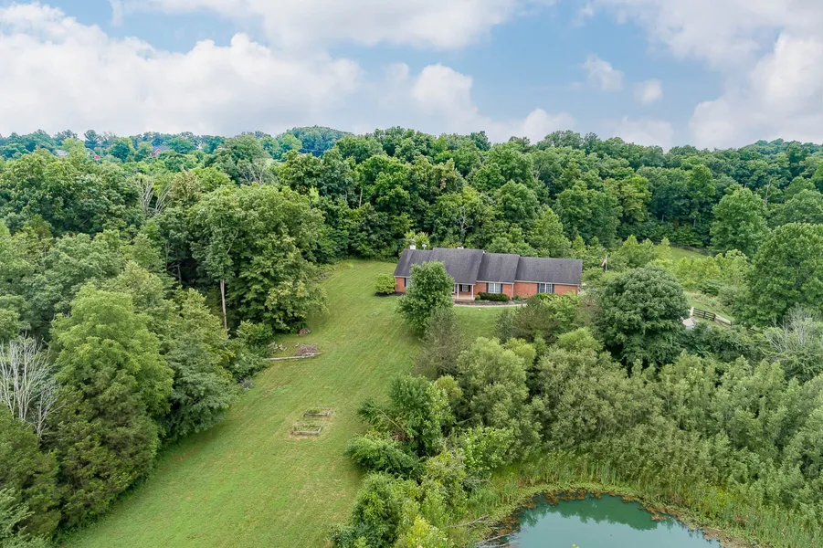 Presenting a quintessential Kentucky experience, Organ Creek offers the rare opportunity to own 16+ private acres of gently rolling Oldham County countryside and forestland, complete with updated 3-bedroom ranch, 3-car garage, and in-ground pool. The renovated home is thoughtfully positioned at the propertys peak, featuring uninterrupted forested, pond, and panoramic views in every direction. The remodeled brick ranch offers a desirable open floor plan with bright windows, sleek hardwood floors, and soaring ceilings throughout the first floor. Past a spacious great room with fireplace, the home's eat-in kitchen has been beautifully updated, featuring stainless steel appliances, breakfast bar, prep island, and granite countertops. The kitchen opens to the gracious dining area with fireplace, offering convenient access to the home's windowed Florida Room, outdoor grilling area, and in-ground pool. The first floor continues with an incredible primary suite with vaulted ceiling, walk-in closet, and luxurious primary bathroom with laundry area. The opposite wing of the home features two spacious bedrooms, perfect for a home office or guest suite, and updated full bathroom. Featuring peaceful rolling pastures, 13 acres of forested woodland, and plentiful wildlife and game, the possibilities for use are endless: whether creating a gentleman's estate farm with convenience to both Downtown Louisville and East End business hubs, enjoying private use of the gently rolling acreage for cropping, hunting, or horses, holding as an profitable AirBnB, or simply creating an everyday getaway in the heart of Oldham County. An offering of this nature is a once-in-a-decade opportunity to secure unspoiled forestland, stunning acreage, and a completely updated home with pool, all within a convenient and scenic drive to the city.