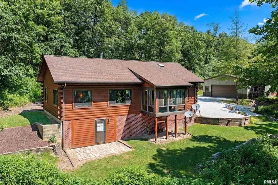 An incredible opportunity to own 16.65 acres of timber with 2 creeks running through it has arrived. Unbelievable care and craftsmanship abound in this meticulously planned and designed Eastern Pine kiln-dried single-owner log home w/walkout basement, while a 36 x 30 Morton outbuilding w/a 220v hookup & 8' garage doors sets the backdrop for every hobby you can think of. Soaring vaulted & beamed ceilings welcome you as you step into a Chef's kitchen of your dreams: custom cabinetry from Eller features lots of storage, Corian counters, oversized pantry & built-in buffet w/rollouts, 4x6 island, JennAir refrigerator and a prep sink set the stage. Efficiency, quality & planning is evident in the water heater (2020), Andersen replacement windows (2019), roof (2017), whole house fan (2016) Generac backup generator w/recent maintenance (2015/2021), 3-season porch (2012), HVAC (2009), long leaf yellow pine hardwood flooring & efficient LED lighting throughout the home. The walkout basement features custom tongue & groove walls, finished storage closets, an office area w/built-in cabinetry & desk w/Corian counters, a plumbed 1/2 bath and PEX & copper piping. Located along a migratory bird corridor, songbirds & woodpeckers join deer, turkey, fox, owls and 3 species of squirrels in a beautiful display of Illinois woodland fauna. Mushroom enthusiasts & tree admirers rejoice! Redbud, sassafras, oak, maple, pine, cottonwood, sycamore & cedar set a beautiful scene throughout all 4 seasons.
