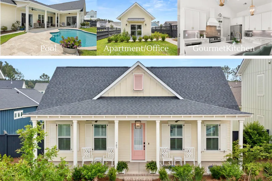 Welcome to 703 Blueway Avenue, a one-of-a-kind Lowcountry retreat in the heart of Nexton's award-wining master planned Midtown community! This stunning New Leaf home has it all starting with a private pool and a finished courtside casita--a fully equipped guest apartment complete with its own bathroom and kitchenette! It's the perfect space for visiting guests, a quiet home office, or even a creative studio. Inside the main home, you'll find just under 1,700 square feet of thoughtfully designed space, featuring 2 spacious bedrooms with en suite baths--a true double master with a spacious layout. The 10-foot ceilings vault up to an impressive 16 feet in the living, kitchen, and dining areas, creating an airy and expansive feel throughout the main living spaces. The home has been beautifully upgraded with a chef's kitchen, including a custom wood hood accent, champagne bronze hardware, and gorgeous finishes that elevate the space. The main master suite is a dream, featuring a zero-entry shower with floor-to-ceiling tile and private sliding door access to the massive covered courtyard patio perfect for relaxing or entertaining poolside. And when you're ready to explore beyond your own slice of paradise, you're just a short golf cart ride from all of Nexton's resort-style amenities: multiple pools, tennis and pickleball courts, a gym, parks, dining, shopping, and more. This home blends luxury, comfort, and functionality like no other in Nexton.