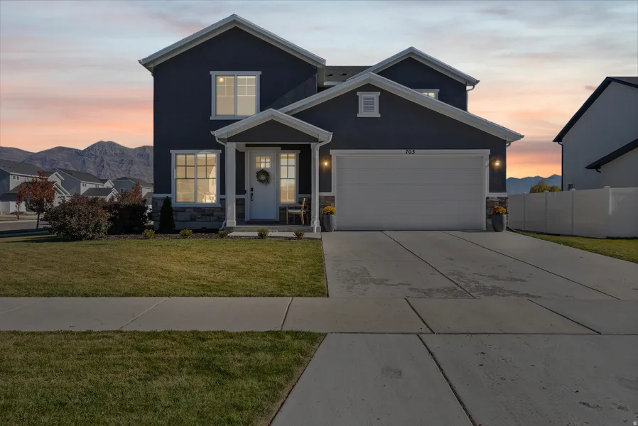 Built in 2022, this charming 3-bedroom, 2.5-bath home combines modern comfort with timeless style on a desirable corner lot. Enjoy a beautifully landscaped front yard with rose bushes, and a fully finished garage. The west-facing orientation provides warm afternoon light for easy driveway snow melt, and a perfectly shaded private patio for a relaxing evening taking in the panoramic mountain views. Inside through the large sliding doors, luxury vinyl plank flooring, open railings, and thoughtful design create a bright, airy feel. The main floor features a potential 4th bedroom with double doors and a convenient half bath. Upstairs, the flexible loft space can easily convert to another bedroom or media area, and every bedroom offers a walk-in closet. The spacious primary suite is a true retreat with room to unwind, mountain views, and a large ensuite bath. Granite countertops, plush carpet, and upstairs laundry add everyday convenience to this well-designed home. Located near schools, parks, trails, the marina, and shopping, this home is perfect for those seeking modern living, smart spaces, and easy maintenance. Come see why this American Fork gem feels like home!