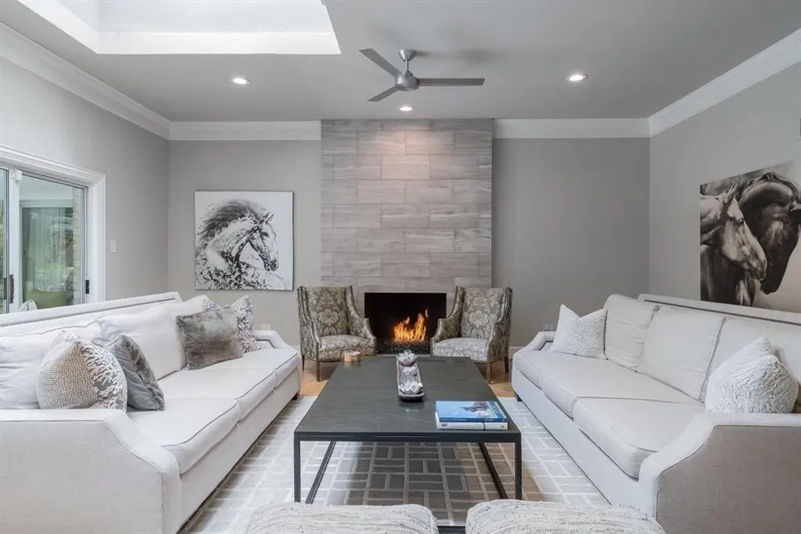 Transitional Remodel Style in Windsor Park - offering 4 beds, 3 living areas, 3 full & 2 powder baths, 2 car attached garage & great outdoor entertaining space; kitchen offers built-in commercial sized refrigerator freezer, double ovens, granite countertops, glass tile backsplash; walk in bar-butlers pantry with ice maker & marble countertops with undermount bar sink - bar serves to den-great for entertaining; den consists of herringbone pattern wood flooring, skylights, gas fireplace boasts floor to ceiling Venetian Marble Tiles & Diamond Fire Glass; West side of house great design for Mother-In-Law Suite or guests privacy; spacious private master bedroom with walk-in closet with built-in drawers & shelves, rain head shower system, bathtub hand sprayer, plenty of storage; white oak wood flooring throughout; marble foyer entry; extended patio, buried power lines, enter garage through wide lane alleyway