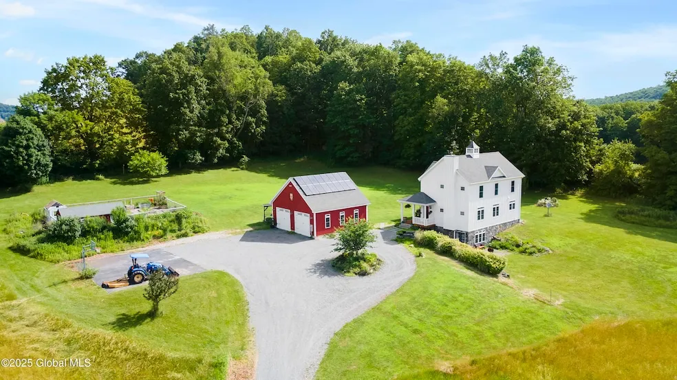 Modern farmhouse built in 2014 with custom craftsmanship and old-world charm on 12.98 scenic acres with panoramic mountain views. Two expansive wraparound porches offer the perfect place to relax and take in the views. This 4-bedroom, 3.5-bath home features a wood-burning stone fireplace with wood mantle, hardwood floors in every room, and a kitchen with custom cabinetry, granite counters, butcher block island, and farmhouse sink. The walk-out lower level offers flexible space used as a family room and workout area. Energy-efficient with owned solar panels and Generac generator. Two-car garage, fenced garden with raised beds. Just 25 mins to downtown Saratoga Springs.