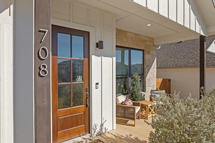 An Exquisite "Lock-Up and Go" Home in Fredericksburg's Post Oak Village. This exceptional 3-bedroom, 2-bathroom home offers a rare opportunity to experience a sophisticated "lock-up and go" lifestyle within the highly desirable Post Oak Village community in Fredericksburg. Integrating the community's sought-after appeal with the refined touch of a top interior designer, this residence stands out for its meticulous craftsmanship, customized finishes, and unparalleled attention to detail. Upon entering, you'll immediately appreciate the superior quality evident throughout. The interior features soaring 9-foot ceilings that enhance the sense of space and light. A sleek marble electric fireplace serves as a stylish focal point, complementing the custom window treatments and an array of hand-picked designer light fixtures that illuminate every corner. The kitchen is a culinary enthusiast's delight, featuring solid wood soft-close cabinets, elegant quartz countertops, a distinctive front tiled kitchen island, and top-of-the-line stainless steel appliances. The flexible floor plan includes a third bedroom, ideal for a dedicated home office or guest suite. Designed for modern convenience, this home is equipped with Smart Home technology throughout, allowing for effortless control and integrated living. Year-round comfort and energy efficiency are ensured by "Full Fill" spray foam insulation, providing superior climate control and reduced utility costs. The exterior of the home presents an engaging blend of limestone and Smart Siding, offering both timeless curb appeal and exceptional durability. The property features fully landscaped and irrigated front and back yards, thoughtfully designed for minimal maintenance. For outdoor entertaining or serene relaxation, a private 14x7 covered back porch provides the perfect setting. This inviting space is ideal for al fresco dining or unwinding in the hot tub, all within the privacy of a fully fenced backyard. This nuanced home truly is exceptional in every way, offering a luxurious and convenient living experience within walking distance of town. It is, unequivocally, a must-see.