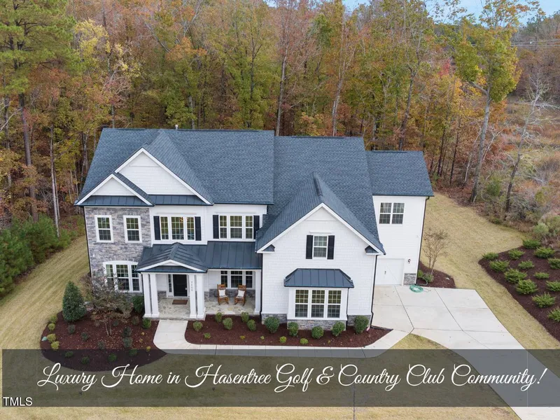 Welcome to this prestigious Executive Home in the exclusive Hasentree Golf and Country Club Community. The inviting rocking chair front porch leads to a stunning two-story foyer. Recently upgraded with engineered hardwoods throughout the main level (except bathroom and laundry), plus new lighting and ceiling fans. The formal dining room showcases a tray ceiling and designer chandelier. The heart of the home features a dramatic two-story family room with custom white stone fireplace, floating shelves, and built-in cabinets. The gourmet kitchen boasts new tile backsplash, premium stainless appliances, walk-in pantry, and breakfast area. A light filled sunroom and dedicated home office complete the main level, along with a guest suite featuring a custom-tiled ensuite bath. The luxurious owner's retreat includes a tray ceiling, sitting area, and Closets by Design walk-in closets. The spa-like ensuite offers dual vanities, soaking tub, and walk-in shower. Three additional bedrooms upstairs include one with private bath and two sharing a Jack-and-Jill bathroom. The unfinished basement (2,329 sq ft) is plumbed for a potential in-law suite with kitchen. Additional features include a new whole-house Generac backup system and professional sound system wiring throughout main living areas. Enjoy the outdoor living on the deck overlooking the private wooded views of nearly an acre!