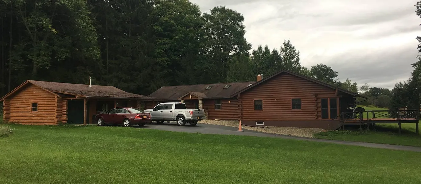 New York land with log home, garage and pond for sale. Beautiful log home situated on 12 surveyed acres with a pond and 2 car garage. This home is move in ready with plenty of room. There are 5 bedrooms and 2 full baths. You enter into the great room and notice the vaulted ceiling, stone work and wood burning stove. The kitchen is located just off from the great room. It is a beautifully maintained maple kitchen that has plenty of room to serve large family gatherings. There is a dining area, media room, sitting room and a screened in porch that leads to the front deck that overlooks the pond. The pond is about 8’ deep. There are bass and sunfish in its waters to enjoy some down time with a fishing pole in your hand.The land that the home sits on is abundant with wildlife including deer and turkey. The acreage is mostly young growth with a nice pine stand behind the house and a field next to it. Located just outside of Cuba, NY the property is just a short drive from both Cuba Lake and Rushford Lake. There is a golf course and restaurant just down the road as well. If you are looking for a country home this is the one. Located in a quiet area on a maintained county road that is just a short drive to town and recreation. All rights transfer with the sale.