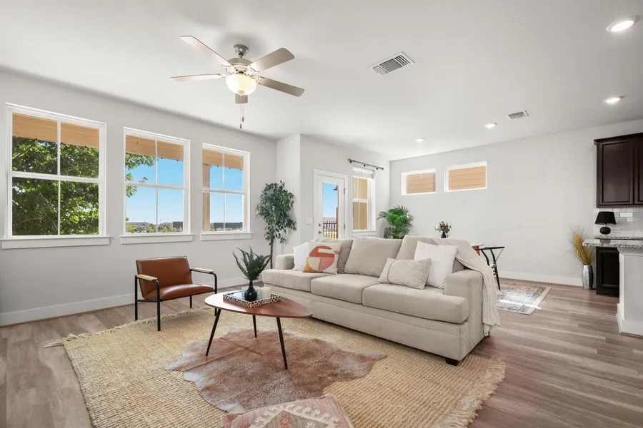 Check out this stunning two-story home in the highly sought-after Easton Park community! With three bedrooms and 2.5 bathrooms, this beautifully maintained Meritage home features a modern exterior with full gutters and an inviting open-concept floor plan—perfect for entertaining. The bright, airy living room boasts high ceilings and natural light, seamlessly flowing into the spacious kitchen. You’ll love the oversized island, granite countertops, stainless steel appliances, and a stylish subway tile backsplash. The dining area, filled with abundant windows, gives direct access to a covered patio and backyard, ideal for indoor/outdoor living. The expansive patio is perfect for entertaining or relaxing, leading to a quaint backyard that backs to a serene open field. Upstairs, you’ll find three bedrooms and two full bathrooms, including an expansive owner’s suite with tray ceilings, plush carpet, and a luxurious en-suite bathroom featuring dual vanities and a walk-in shower. There’s also an extra living space upstairs that offers flexibility for a playroom, office, or lounge! Enjoy community amenities just a short stroll away: dog park, clubhouse, pool, gym, playground, and trails. Plus, you’ll love the easy access to McKinney Falls Parkway and William Cannon for a smooth commute. Don’t miss out on this gem—schedule your showing today!