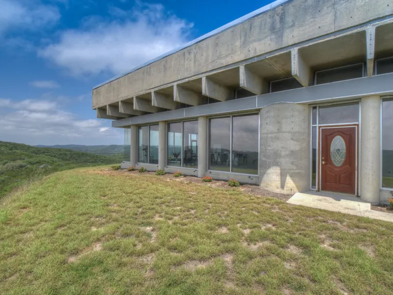 Rare offering of a custom-designed contemporary retreat built into the side of a mountaintop on 42 acres, with spectacular, panoramic views for miles of the surrounding Texas Hill Country wilderness. This large-scale luxury home is the ultimate get-away escape, where you can watch glorious sunrises peek over the eastern hills and gorgeous sunsets descend over the western hills and valleys from your windows. The exterior walls of this earth-sheltered engineering marvel are composed of 9-ft-high, double-paned glass windows, and the ceilings soar to a height of over 13 feet. This green dwelling was designed for optimum energy-efficiency and maximum utility bill savings.