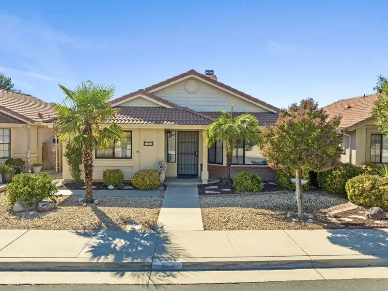 If you are looking for a well maintained, move-in-ready home in a 55+ community in Hemet - THIS IS IT. The community of Hemet Del Sol shows pride of ownership and has a great feel as you drive through the neighborhood to this home. From the front, enjoy beautiful sunrise views and in the winter, peak out at the snow-capped mountains to the East. The interior boasts water-proof vinyl and tile flooring in all but the carpeted bedrooms - great for easy maintenance. The kitchen is nicely situated with a window off the sink to the back patio, a large walk in pantry and granite counters and canned lighting. The two bedrooms are generously sized, with the primary suite offering separate sinks and a walk-in-shower. Enjoy the privacy of the back yard and take advantage of the double gates and storage area for your boat, small trailer, or other toys should you need it. This is a fantastic home with great curb appeal, well positioned within the neighborhood and close to all the shopping and amenities you need. Come make it home!