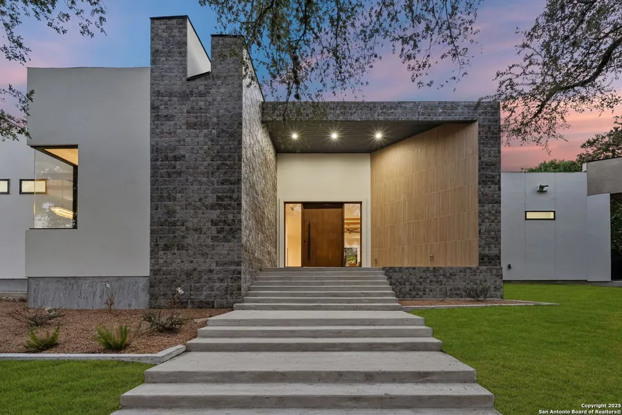 Recent price improvement - Introducing a residence where modern artistry and everyday luxury converge. 718 Ridgemont rises from its elevated lot with an unforgettable architectural presence-a bold, sculpted facade of stone, wood, and glass framed by mature trees and a dramatic entry staircase. This is modern design at its most refined. Step inside to a world of clean lines and curated textures. Wide-plank white oak floors flow through expansive living spaces bathed in natural light. An open-concept great room anchors the home, enhanced by architectural ceiling beams, a sleek fireplace, and an exquisite glass-front wine installation that serves as both art and entertainer's dream. The chef's kitchen is a showpiece unto itself-double sided waterfall islands, designer pendant lighting, custom cabinetry, commercial-grade appliances, an oversized built-in refrigerator, AND walk in pantry. Whether hosting intimate dinners or large gatherings, the seamless connection to the dining room, office, and backyard creates unmatched flow. Just off the dining room, the glass-enclosed office offers a dramatic work-from-home environment with views of the front grounds. The thoughtfully designed floorplan places three bedrooms on the main level, including the primary suite-an airy retreat with a full glass wall overlooking the pool and backyard. The spa bath brings resort living home with a freestanding soaking tub, an oversized shower with gold fixtures, dual vanities, and a boutique-style dressing room featuring custom built-ins and a chandelier centerpiece. Upstairs, a private bedroom suite + loft offers limitless flexibility-ideal for multigenerational living, an artist studio, game room, gym, or secondary living area. In the backyard, clean contemporary lines frame a sparkling pool surrounded by a wrap-around patio, lounge areas, and total privacy-turning the outdoor space into a true modern oasis. Perfectly located in prestigious Terrell Hills, this nearly new residence embodies luxury craftsmanship, forward-thinking design, and a lifestyle of elevated simplicity.