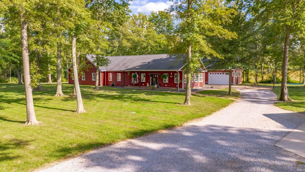 This beautiful 5 bedroom, 4.5 bath custom built home sits on a secluded 4.26 acres in southern Spencer County. Surrounded by farmland and trees, this property has an abundance of amenities. As you enter the home from the covered front porch, you will walk into an open living room/kitchen/eating area with windows overlooking the property. The beautiful kitchen has custom Amish cabinetry and a breakfast bar. Off the kitchen you will find the laundry room, half bath, shoe/coat built in storage, and a small desk area. As you head down the main hallway, you will see the main hall bathroom, a bedroom, a spacious office (that could easily be turned into a 6th bedroom), and then you will head into the main bedroom suite. The main bedroom is very spacious, with windows overlooking the backyard, and has 2 walk in closets and an en suite bathroom. Continue down the hall and you will find 2 more bedrooms with a Jack-n-Jill bathroom. Upstairs is the 5th bedroom with its own full bathroom. From upstairs you will get a fantastic view of the HUGE bonus room! This room is stunning in size and has large windows overlooking the backyard and patio doors going outside. Just off the open patio, you will find a hot tub under the covered patio with a stunning wood accent wall and ceiling. The detached garage has radiant floor heat, walk up storage space, a room currently being used as a weight room, and a great space to practice your free throws! The pole barn garage has a kitchen area and full bath, along with more storage and a lean to. With custom Amish cabinetry throughout this home, including the built in entertainment center, this well maintained home is truly one of a kind!