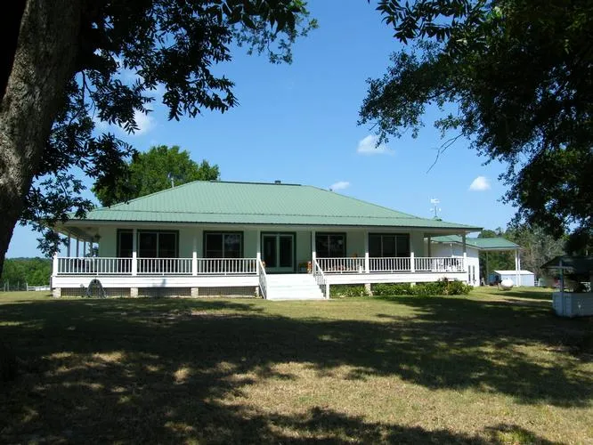 A working 72-acre cattle ranch with a beautiful "Southern Living" home, plus a pretty brick foreman's house (or rental) at front gate, with 2 lakes, huge workshop, barns, corrals, stable and more. Back boundary is Billum's Creek, lovely sand-bottomed creek where once an Indian village was sited; artifacts still being found there; abundant wildlife. Secluded open concept main home features wraparound porch, rooftop viewing deck, split bedroom plan. Wood planked floor, massive oaken fireplace, island kitchen with solid-surface countertops and lots of custom cabinetry, adjacent dining room and large utility room. Panoramic views from every room in the house. Master wing has french doors to porch and ensuite bath with multi-head shower and fabulous closet. Guest bedroom wing has 2 bedrooms with hollywood bath. Three-car garage/workshop with half bath, with large attached RV-port, plus huge space above shop, currently used as storage but could be finished out for game room or guest space. Property is drop-dead gorgeous, with rolling hills and massive trees. Fenced and cross-fenced.