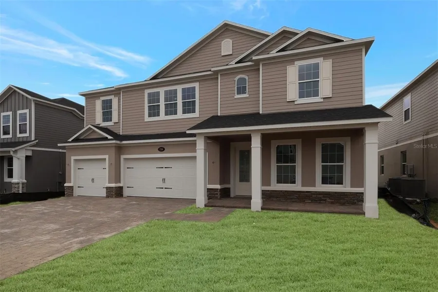 Under Construction. Welcome home to 720 Pointe Emerson Boulevard in Apopka! This gorgeous new construction home features 5 bedrooms, 4 bathrooms, a formal dining room, a 12' x 10' lanai, a spacious second-floor loft, and so much more. An impressive foyer leads you into the home and is the focal area to meet and greet your guests to bring them inside. A formal dining room with pass through an elegant stairway take you towards the heart of the home. As you enter the main living area, you'll be stunned by the grand, open-concept space that encompasses the great room and massive kitchen, with its expansive windows and natural light. The large kitchen will leave you breathless, as it has plenty of storage with a pantry, banks of cabinetry, a huge kitchen island, 42-inch cabinets, and it also has panoramic views of the great room and backyard. A first-floor guest suite and full bath are available for guests to the home. The second floor offers a large loft, which is perfect for movie night or game day. Three secondary bedrooms, a second bathroom, and the owner’s suite complete the second floor. The owner’s retreat even features rear facing windows! Come see what makes 720 Pointe Emerson Boulevard so special.