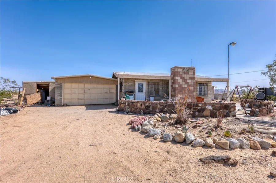 Opportunity knocks in the high desert! Set on a sprawling 5-acre corner lot just minutes from the entrance to the Marine Corps base, this 2-bedroom, 1-bath home is brimming with potential and character. Built in 1956, the home exudes vintage desert charm with vaulted ceilings, classic block and brick construction, and a striking rock archway that beautifully frames the transition from the living room to the kitchen. The cozy 660 sq. ft. interior is ready for a creative vision and some much-needed TLC to bring it back to life.