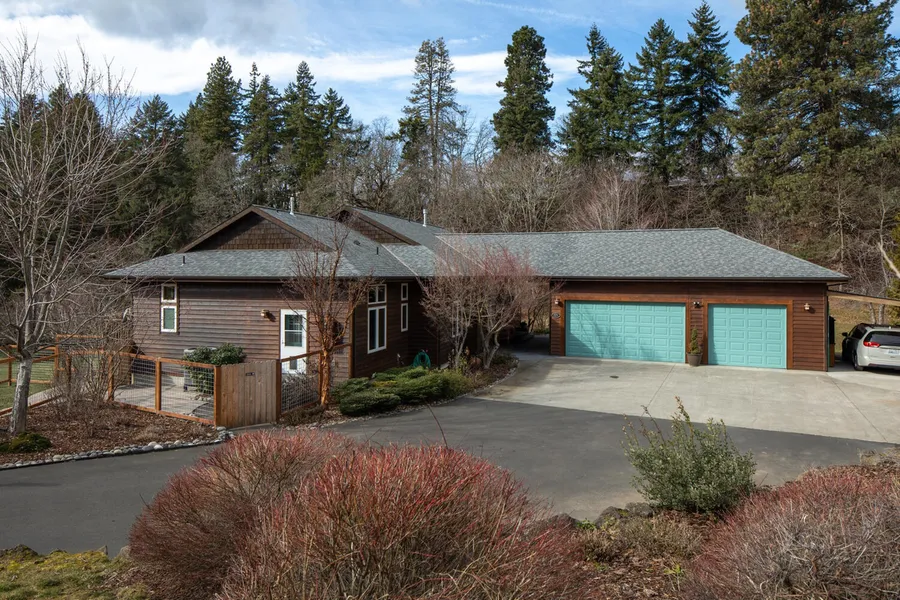 Own over an acre of tranquility just a mile+ from downtown White Salmon. With sweeping Mount Hood Views, this custom single-level home offers luxury finishes, attached finished three-car garage/studio with private outdoor living and garden space. The grande south-facing deck allows exterior access throughout the home, including the attached greenhouse for all your plants or additional living. Own your own mini Lambert Cherry Orchard along with a Flowering and Plum Tree! Well maintained exterior with refreshed cedar siding, in-ground irrigation with 12-zones and mature landscape drip system, additional outdoor storage in the attached carport, fenced-in yard, stamped concrete entry, and more! Interior highlights include tailor-made cabinetry, custom wood-framed view windows, Bosch and Fisher & Paykel appliances, primary bedroom deck walk-out, double vanity with grandeur walk-in closet, and tile bathroom floors. Extra-large second bedroom with opportunity to divide. Schedule your private viewing today!