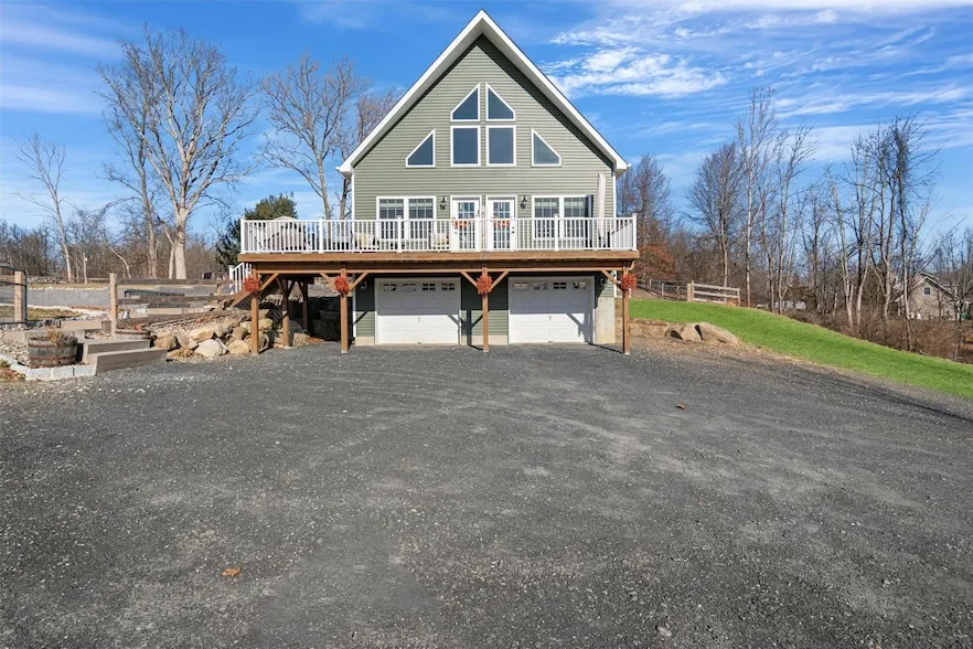 Young Contemporary Chalet on a Private 3+ Acre Wooded Lot! This stunning contemporary chalet offers the perfect blend of modern living and serene retreat! Nestled on over three acres of wooded privacy, the home is set back from the road, providing a tranquil escape while remaining conveniently located near schools, shopping, major highways, Stewart International Airport, hospitals, and transportation options, including Metro-North to New Jersey and New York City. The home features 4 bedrooms, 3 full baths, and an open-concept design with vaulted ceilings, exposed wrapped beams, and gleaming hardwood floors. At the heart of the living space is a wood-burning stone fireplace, creating a warm and inviting atmosphere. The gourmet kitchen is a chef s dream, showcasing a tiled backsplash, granite countertops, stainless steel appliances, and a peninsula with breakfast bar seating that seamlessly flows into the dining and great rooms, making it ideal for entertaining. The primary suite serves as a private sanctuary, complete with a tray ceiling, walk-in closet, and a spa-like ensuite bath featuring a double vanity, walk-in shower, and frameless glass doors. Two additional bedrooms, a full bath, and a convenient laundry area complete the main level. Upstairs, a versatile loft overlooks the great room, offering stunning exterior views, and is accompanied by a fourth bedroom and another full bath perfect for guests or a private home office. The lower level provides access to a two-car garage, a separate exterior entrance, and a partial basement with an egress window, offering 800+/- square feet of potential additional living or recreational space. Outdoor living is just as impressive, with a large entrance deck, a beautiful stone patio, and a fenced yard, perfect for relaxation or entertaining. A newly constructed 1,200-square-foot pole barn (built in 2023) adds versatility for extra storage or workshop needs. Modern comforts include central air conditioning and energy-efficient spray foam insulation, ensuring year-round comfort. Situated in the sought-after Minisink Valley School District, this property is also close to the recreational and cultural amenities of the Hudson Valley, making it a truly exceptional find. Schedule your private tour today and click the Virtual Tour link to explore additional photos, floor plans, and videos showcasing the beauty and convenience of this remarkable property.