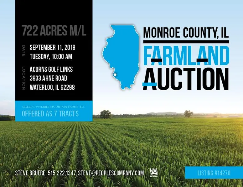 Offering 722.27 acres m/l of diverse Monroe County, Illinois farmland in seven tracts. Tracts range in size from 19.25 acres m/l to 286.64 acres m/l as this unique portfolio offers everything from high quality tillable acres to excellent recreational ground with access to the Mississippi River. Improvements on multiple tracts include well maintained grain bins and metal storage buildings. These farms are located within a five mile radius of one another near Fults, IL - approximately 25 miles south of St. Louis, MO and 12 miles west of Red Bud, IL in Precinct 13 and Precinct 15 Townships. Dont miss this opportunity to maximize operational efficiencies and acquire a large portfolio of diverse assets in a strong area.