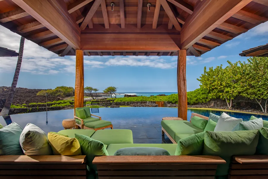 Looking out over Kapaka Bay, the primary bedroom suite boasts a spa-like bath with solid teak vanities, dual walk-in closets, a soaking tub, and a steam shower with bookmatched Calacatta marble slabs. Ipe decking surrounds the suite’s secluded outdoor shower and cold plunge pool. Just a short walk down the Mai Tai Trail from 72-3023 Kapaka Place leads to water sports in one of the island’s most picturesque bays, along with fine dining and the spa and fitness facility at the Kukio Golf and Beach Club.
