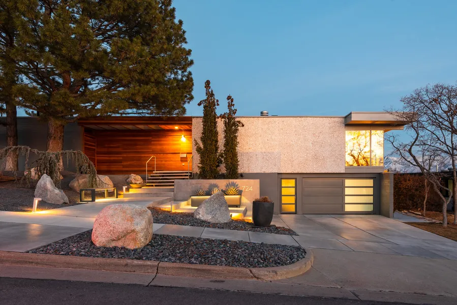 A classic Mid-Century home typically offers a private front, with a glass-walled rear. The previous owner of this home collaborated with Red Butte Garden’s horticulturist to meticulously select foliage suitable for the yard. Notably, the home boasts a prized cactus plant transported from Arizona by the homeowner himself. This Eduard Dreier home embodies the essence of Mid-Century Modern architecture, featuring a new steel floating staircase leading to the front door. It is flanked by a solid travertine rock wall on one side and a solid minimalist brick wall on the other. A cantilevered roofline extends the entire length of the rear, providing multiple seating areas to admire the surrounding mountains, canyons, and trails. External walls and ceilings extend outward, resembling the wings of a child’s imagination. The natural balance and beauty of the structure evoke a sense of wonder, prompting the question of why every building is not constructed in this manner.
