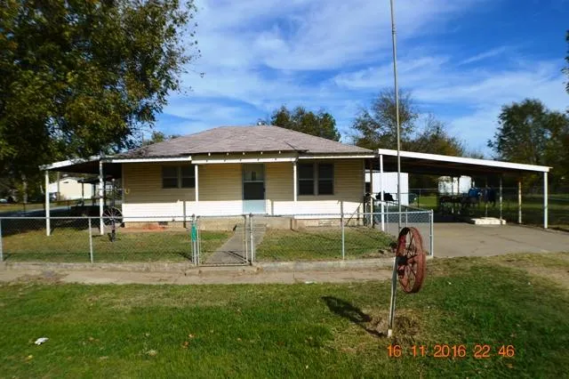 Location is key... located on the N side of Highway 9 aka Speer Street in Dustin, OK. Within walking distance to a lot of amenities. Currently a residence, but could be a commercial location. Stove and fridge will stay. A full hall bath w/new stool. Large laundry room could also be used as an additional bedroom. Outside features include a huge chain-link fenced back yard, almost half an acre, 4 car attached carport, a wrap around, covered Red Steel patio, covered dry storm cellar w/electric. Detached 40x20 shop with overhead door for the garage, a 26x20 storage building for RV w/overhead door. Window air unit and gas wall heat, new texture and paint. Roof is approximately 5 years old, vinyl siding. Furniture will stay. You dont want to miss this opportunity!