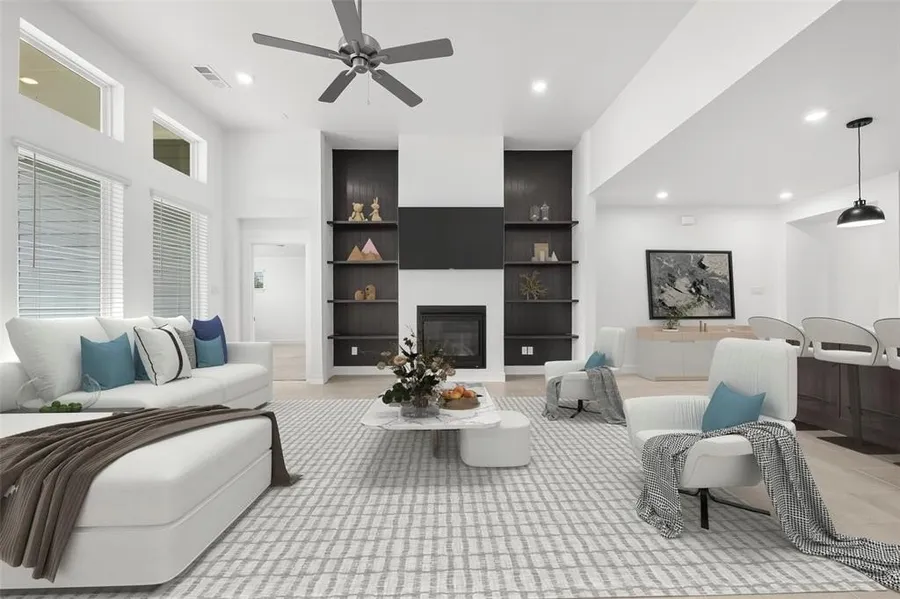 Step inside and experience soaring 12’ ceilings, an open floor plan, and a show-stopping kitchen at the heart of the home. With an oversized custom pantry, a touchless motion-sensor faucet, and seamless flow into the living area, this space was built for both everyday comfort and effortless entertaining. The living room features a cozy fireplace framed by custom built-ins, creating a warm and inviting focal point.